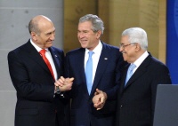 ANNAPOLIS, Md. (Nov. 27, 2008) Israels Premierminister Ehud Olmert, links, Präsident George W. Bush, und der Palästinensische Präsident Mahmoud Abbas - Foto: Wikimedia Commons - Autor: U.S. Navy photo by Gin Kai (gemeinfrei)