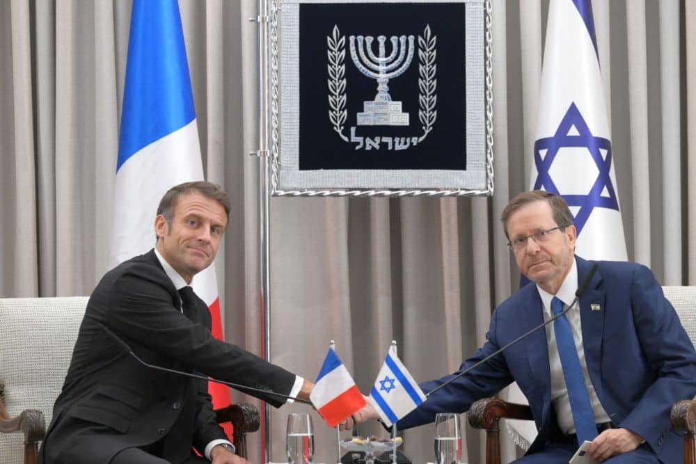 Staatspräsident Yitzhak Herzog bei einem Treffen mit dem französischen Präsidenten Emmanuel Macron, der Israel am 24. Oktober 2023 besuchte - Foto: Wikimedia Commons - Autor: Amos Ben Gershom/GMO - Lizenz: s.u.