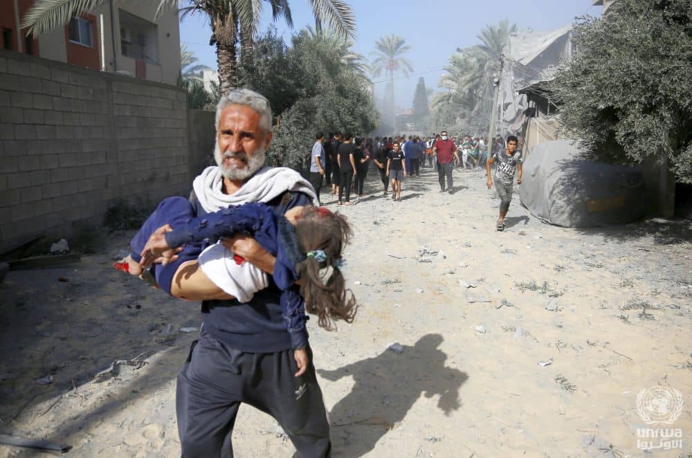 ...verletztes Mädchen bei einem israelischem Luftangriff auf ein Haus in Deir al-Balah, Gazastreifen, 9. November 2023 - Foto: Wikimedia Commons - Autor: Hilfswerk der Vereinten Nationen für Palästina-Flüchtlinge im Nahen Osten - Fotograf: Ashraf Amra - Lizenz: s.u.