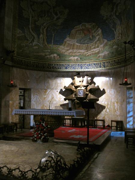 Es handelt sich hier um eine flache Höhle, die von Landarbeitern seit alten Zeiten zur Olivenverarbeitung benutzt wurde. Man sagt, Jesus und seine Jünger hätten hier auf ihren Wanderungen nach Bethanien Schutz vor dem Winterregen und der Sommersonne gesucht. 1956 wurde hier eine Ölpresse aus der Zeit Jesu gefunden. Direkt bei der Höhle liegt auch das alte Landgut „Gethsemane“, wo noch immer die uralten Olivenbäume des Gethsemanegartens zu finden sind. Auch die Kirche aller Nationen (Basilika des Todeskampfes - Basilika der Agonie) wurde hier errichtet. Die Kirche ist aufgrund ihrer schönen Fassade schon von Weitem erkennbar. Drei monumentale Torbögen mit schön gearbeiteten Säulen und ein mit Mosaiken ausgestattetes Giebelfries schmücken den Eingangsbereich.