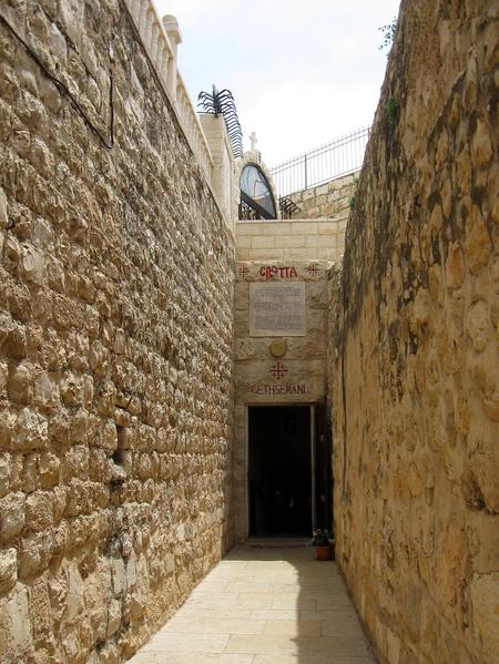 Hier in oder an der Grotte im Garten von Gethsemane ist nach der christlichen Tradition die Stätte des Verrats und der Verhaftung von Jesus. Diese Grotte ist natürlichen Ursprungs. Sie ist 17,60 Meter lang, 11,40 Meter breit und 3,50 Meter hoch. Der Name Gethsemane, der sich sowohl auf die Grotte als auch auf die Umgebung bezieht, ist aramäischen Ursprungs. Es ist ein einzelnes Wort, das aus zwei getrennten Wörtern zusammengesetzt ist: Gat (Presse) und Shemanim (Öle); Die Worte beziehen sich zusammen auf eine „Presse“ oder auf ein „Lagerhaus für Öl“, das hier in der Grotte einmal vorhanden war. Die Überreste der Ölpresse wurden durch die Ausgrabungen von Pater Vigilio Corbo OFM im Jahre 1956 ans Licht gebracht.