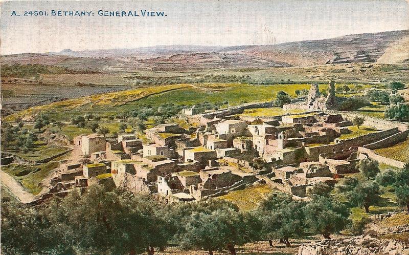 Unweit von Bethphage lag auch Bethanien (15 Stadien von Jerusalem entfernt), von dem es zwei Orte in der Bibel gab- der eine lag östlich des Jordan (wird heute mit Bethabara identifiziert, einer Jordanfurt in der Nähe der Taufstelle Jesu) und der andere am östlichen Abhang des Ölbergs. Bethanien wird häufig im Neuen Testament erwähnt, besonders in Erinnerung ist die Geschichte von der Auferweckung des Lazarus (Joh 11), einem Bruder von Maria und ihrer Schwester Martha. An dem genannten Ort soll Lazarus die vier Tage bis zu seiner Auferstehung gelegen haben. Nach dem Zeugnis des Hieronymus scheint dort um 390 eine kurz zuvor erbaute Kirche gestanden zu haben. Später wurde dieser Ort nach Lazarus „Lazarion“ genannt. Der Ort heißt heute arabisch El-Azarjeh und liegt in Palästina. [2]