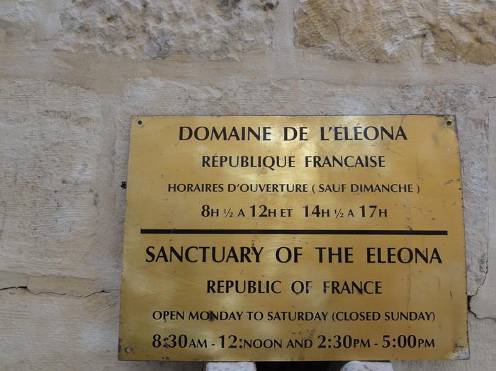 Der Wiederaufbau wurde 1927 eingestellt, als die Mittel ausgingen und die erneuerte Kirche von Eleona unvollendet blieb. Die kleine Klosterkirche steht am östlichen Ende des modernen Klosters, während die teilweise rekonstruierte byzantinische Kirche westlich davon steht. Die byzantinische Kirche aus dem 4. Jahrhundert wurde teilweise rekonstruiert und vermittelt einen guten Eindruck davon, wie das Original aussah. Die Maße der Kirche sind die gleichen wie das Original und der Garten außerhalb der drei Türen umreißt den Atriumbereich. Die Kirche ist nicht überdacht und hat Stufen, die in eine Grotte führen, wo einige Christen glauben, dass Jesus seinen Jüngern seine Prophezeiung der Zerstörung Jerusalems und der Wiederkunft offenbart hat.