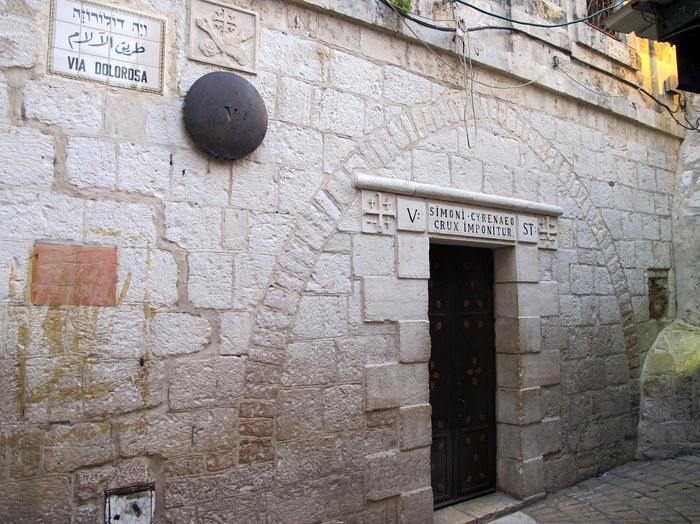 Das Oratorium der Franziskaner markiert die 5. Station des Kreuzwegs an der Via Dolorosa in der Jerusalemer Altstadt. Unter dem angedeuteten Spitzbogen im Mauerwerk steht die Inschrift in lateinischer Sprache: Simoni - Cyrenaeo Crux Imponitur. Hier an dieser Stelle soll ein gewißer Simon von Cyrene das Kreuz Jesu auf seine Schultern geladen haben, nachdem ihn ein Trupp römischer Soldaten dazu zwang.