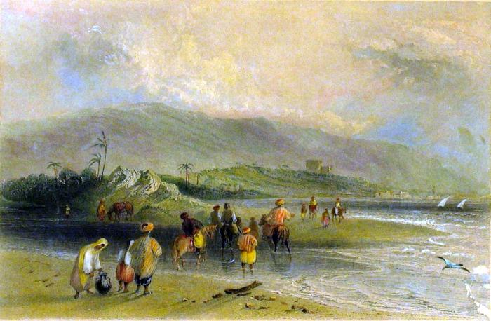 ...historische Ansicht des Tell Abu Hawam, im Hintergrund Haifa - Grafik: Wikipedia (gemeinfrei)