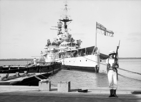 H.M.S. Repulse vor den Docks von Haifa - Marine Wache vor britischer Flagge, 1938 - Foto: Wikipedia (gemeinfrei)