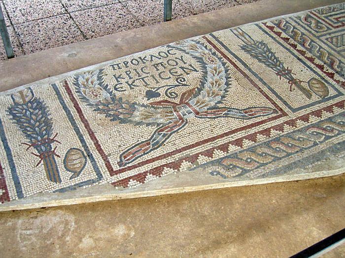 Detail eines Mosaikfußbodens einer Synagoge in Tiberias, 7. - 8. Jahrhundert n. Chr. mit griechischer Inschrift - Bildquelle: Wikipedia (Public domain)