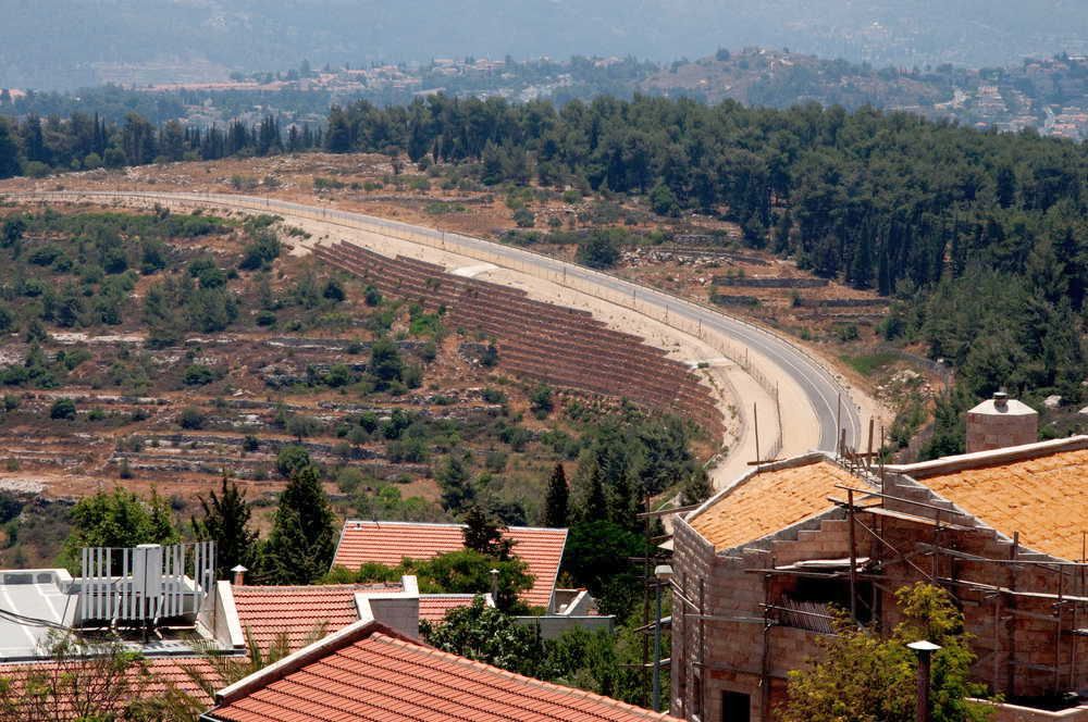 Blick von Har Adar (im Vordergrund) auf eine vom Militär genutzte Straße, die auch gleichzeitig die Grenze zur Westbank darstellt - Foto: Wikipedia - Autor: Josh Evnin - Lizenz: s.u.