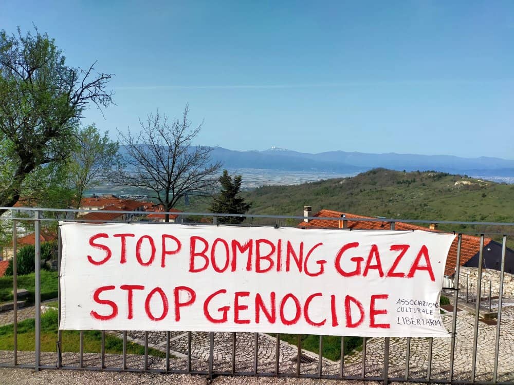 Banner gegen die Bombardierung und Tötung von Zivilisten in Gaza - Foto: Wikimedia Commons - Autor: Marica Massaro - Lizenz: s.u.
