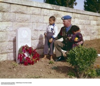 UN-Personal am Grab von Gerald S. Porter auf dem Gaza-Kriegsfriedhof, mit zwei palästinensischen Kindern, Angehörigen der Familie Jaradah (Jeradeh) - Foto: Wikimedia Commons - Autor: unbekannt - Kanada. Verteidigungsministerium / Bibliothek und Archiv Kanadas - Lizenz: s.u.
