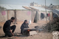 Khadija Hawila, eine 70-jährige vertriebene Großmutter, backt mit Hilfe ihres Sohnes Mahmoud Brot vor ihrer Unterkunft in Rafah - Foto: Wikimedia Commons - Autor: Mohammed Hinnawi - UNRWA: United Nations Relief and Works Agency for Palestine Refugees in the Near East - Lizenz: s.u.