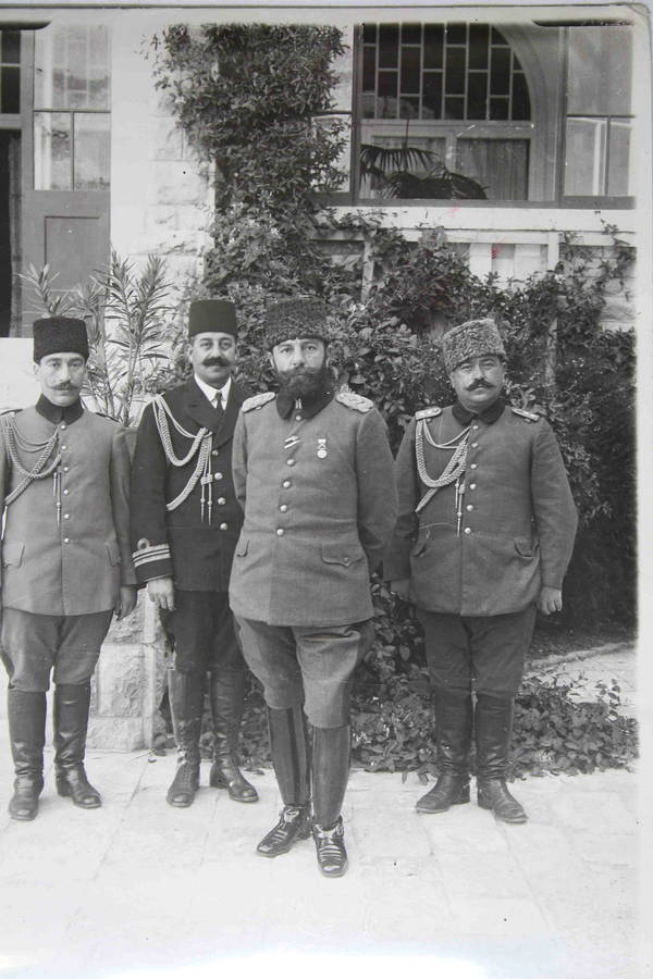 Hassan Bey (rechts) mit Cemal Pascha (vorn) und weiteren osmanischen Offizieren, Erster Weltkrieg 1914 - 1917 - Foto: Wikimedia Commons - Autor: The Education Center of the National Library of Israel - The National Library of Israel Collections - Lizenz: s.u.