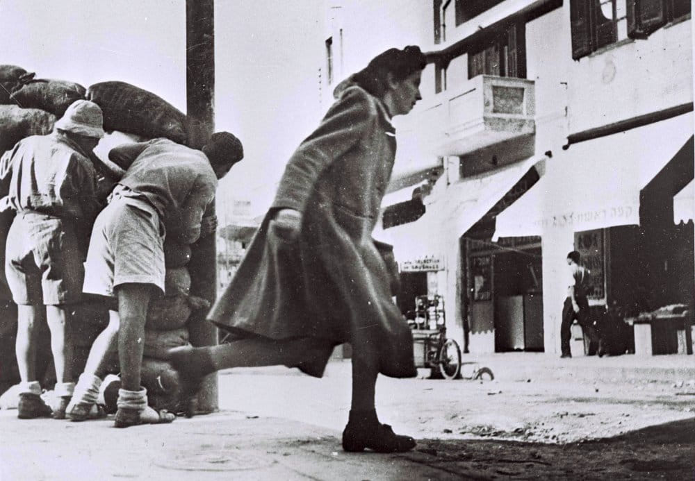 Tel Aviv - am Carmel-Markt suchen eilend Passanten Deckung vor Schüssen, um den Scharfschützen vom Minarett der Hassan-Bek-Moschee zu entgehen, 25. Februar 1948 - Foto: Wikimedia Commons - Autor: Hans Pinn (gemeinfrei)