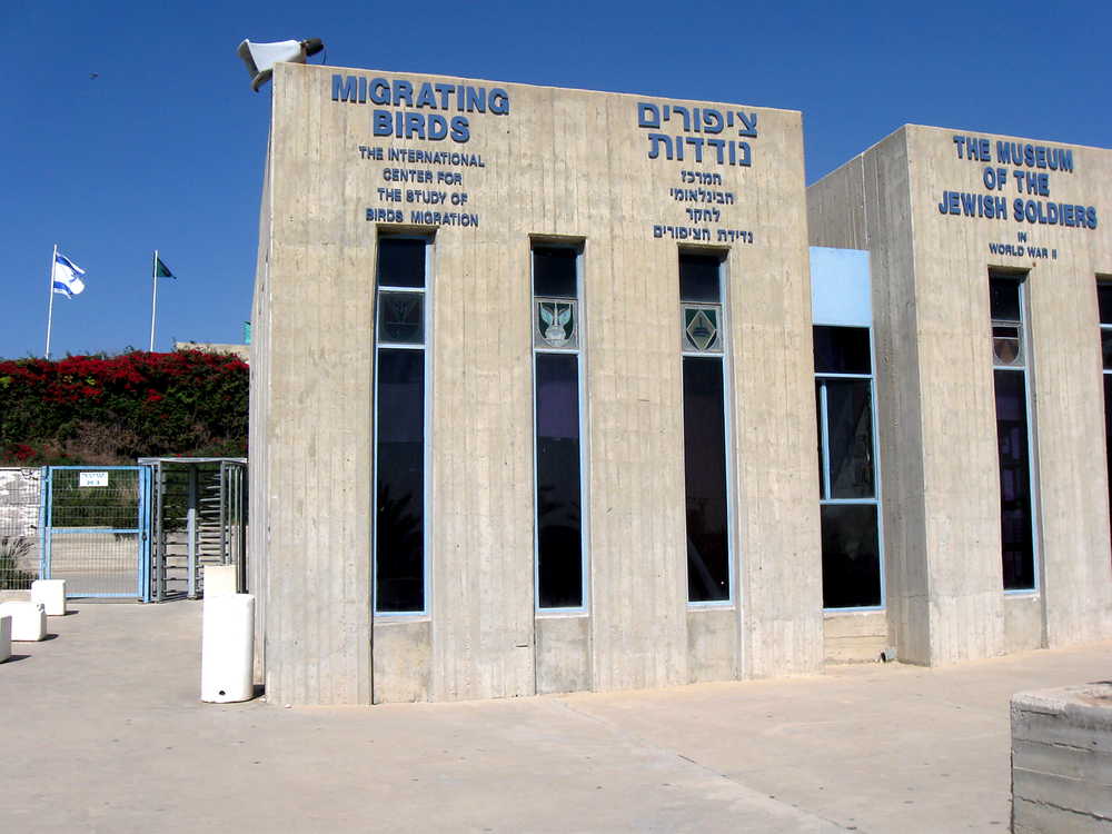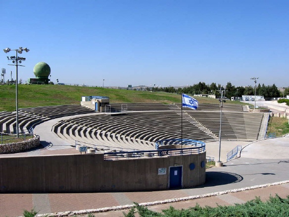 Amphitheater des Yad la-Shiryon Museum in Latrun - im Hintergrund links das „International Center for the Study of Bird Migration“ - Foto: Wikipedia - Autor: Ori~
