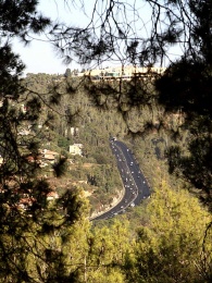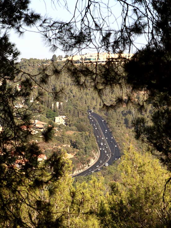 Autobahn A1 nach Jerusalem - Links: Motza Illit, im Hintergrund die Harel Mall - Foto: Wikipedia - Autor: Zeevveez - Lizenz: s.u.