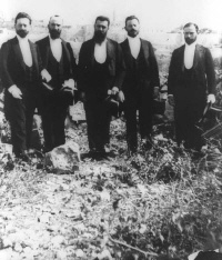 Theodor Herzl (Mitte). Abgebildet ist die Delegation der Zionisten unter Führung Herzls, die am 2. November 1898 nach Palästina gekommen war, um mit Wilhelm II. zusammenzutreffen. Von links nach rechts: Max I. Bodenheimer, David Wolffsohn, Herzl, Moses Schnirer, Joseph Seidener - Foto: Wikipedia (gemeinfrei)