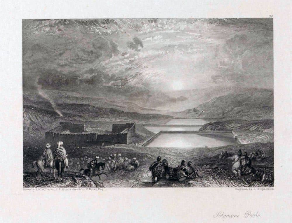 "Die Quellen, welche die Teiche mit Wasser versehen, sind mit sehr großer Sorgfalt gesichert und haben nach dem Verfasser der Reise nach Aleppo keinen anderen Zugang als eine kleine Höhle, welche der Mündung eines kleinen Brunnens gleicht. Durch diese Höhle steigt man ungefähr 12 Fuß hinab und gelangt dann in einen Raum von 45 Fuß Länge und 24 Fuß Breite. Es stößt daran eine andere etwas weniger geräumige Kammer. Beide sind gewölbt und sicher sehr alt. Das aus vier verschiedenen Quellen sich sammelnde Wasser wird theils durch einen unterirdischen Weg in die Teiche geleitet, theils durch eine Wasserleitung mit steinernen Röhren durch manche Krümmungen und Windungen zwischen den Bergen nach Jerusalem befördert. Die Mönche in Bethlehem sind vollkommen überzeugt, daß Salomon in einer sehr passenden Anspielung auf diesen aufbewahrten Wasservorrath seine geliebte Braut eine versiegelte Quelle nannte." [1]